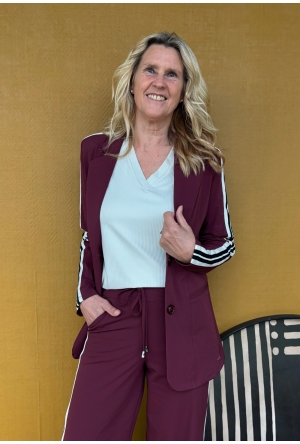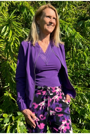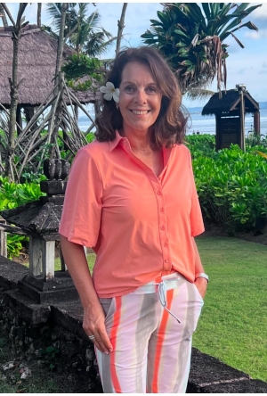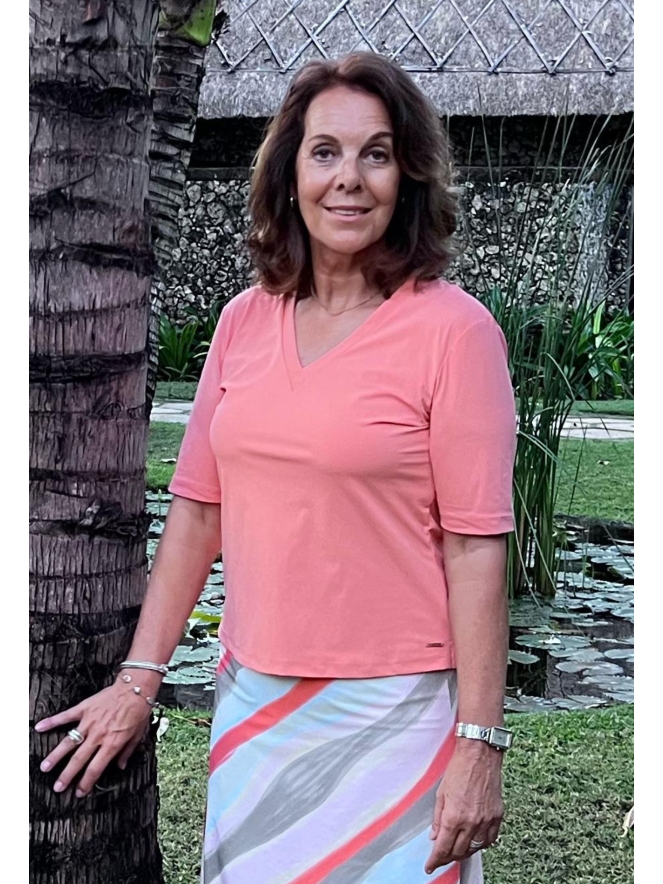 Fijne basic top van Mi Piace in de kleur grape apple ofwel abrikoos. Met V-hals en een halve mouw. Draagt fijn door de travelstof waar Mi Piace om bekend staat!