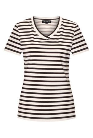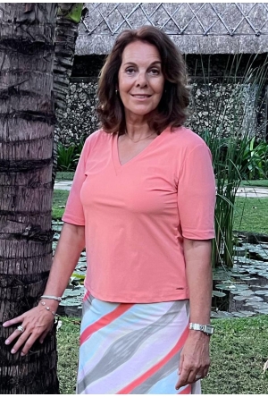 Fijne basic top van Mi Piace in de kleur grape apple ofwel abrikoos. Met V-hals en een halve mouw. Draagt fijn door de travelstof waar Mi Piace om bekend staat!
