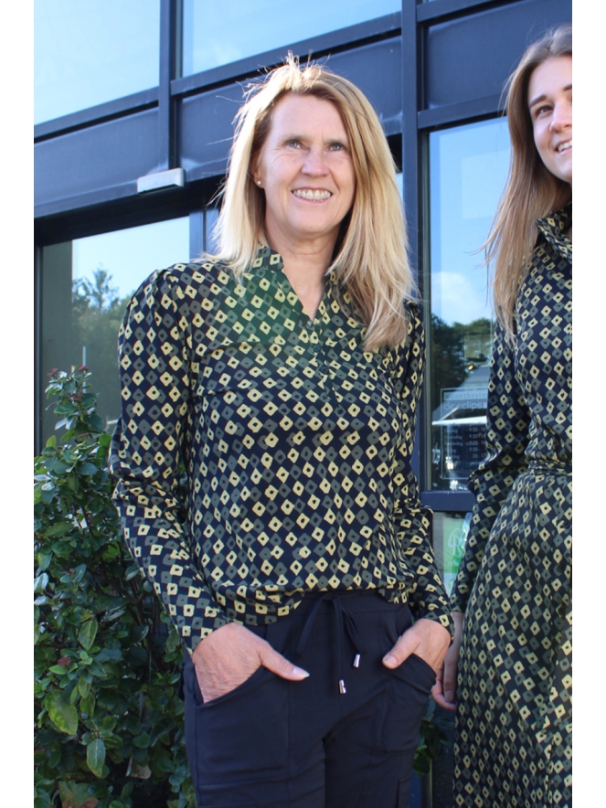 Dames blouse van travel stof. Deze blouse heeft een allover print met kleine ruitjes in de kleurstelling zwart donkergroen mosterd. De blouse heeft knoopjes tot halverwege de voorkant met een lichte pofmouw.