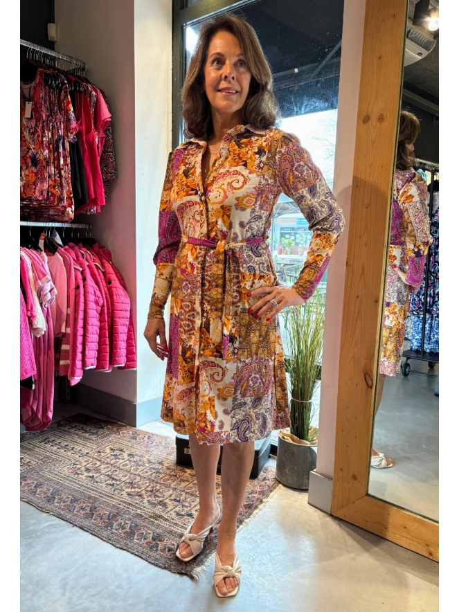 Doorknoopjurk van travel stof met een levendige patchworkprint. Deze kreukvrije jurk biedt ultiem draagcomfort dankzij de stretch. De bijgevoegde ceintuur accentueert prachtig de taille. Een veelzijdige keuze voor elke gelegenheid.