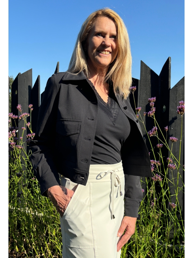 Nieuw van Mi Piace is dit jasje van Travel stof. Dit model heeft twee grote zakken, mooi kraagje en sluit met knopen. Leuk om te dragen over een hemdje of T-shirtje!