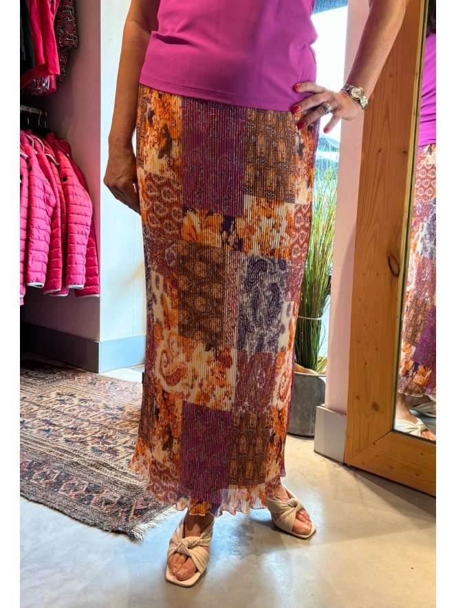 Lange plissérok met patchworkprint. Valt net boven de enkels voor een elegante look. Gemaakt van lichte, ademende stof die meebeweegt met elke stap. Elastische tailleband voor een perfecte pasvorm. Perfect voor dagelijks comfort en stijl.