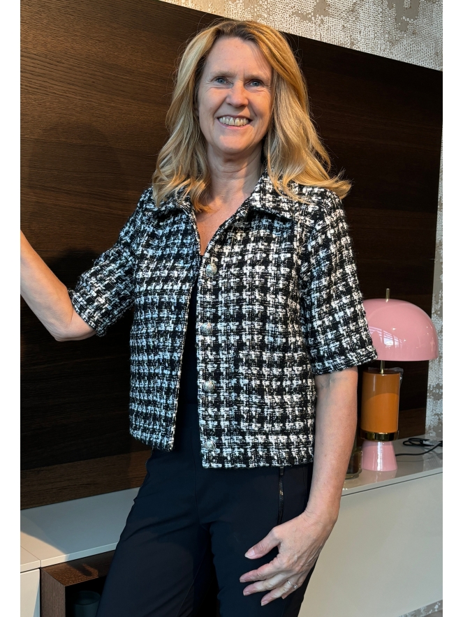 Dit zeer nette Boucle Chanel jasje van Mi Piace is echt wat anders dan de Travel die je van ze gewend bent! Stijlvol voor de dag komen? Kies dan voor dit exemplaar met zilverkleurige knopen en twee zakjes voorop. Casual sjieck!