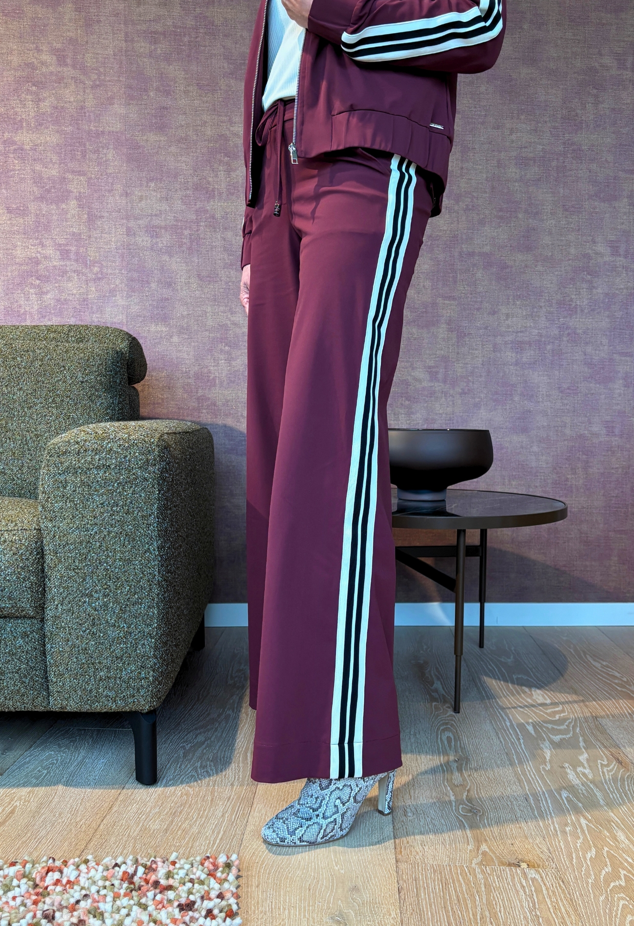 Trendy broek van Mi Piace met een wide fit en een gestreepte bies op de zijkant van de broek. Met fijne steekzakken en de welbekende sier klepzakjes achterop. Wist je dat we het hele pak voor je hebben? Stijl het af met een sporty blazer of net jack in bombermodel.