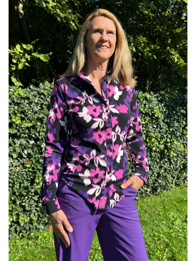 In de Travel serie van Mi Piace vind je ook ditmaal weer een pareltje, namelijk deze blouse met vervaagde bloemenprint. Deze doorknoop blouse heeft weer de vertrouwde pasvorm en kwaliteit die je van de blouses van MP gewend bent.
