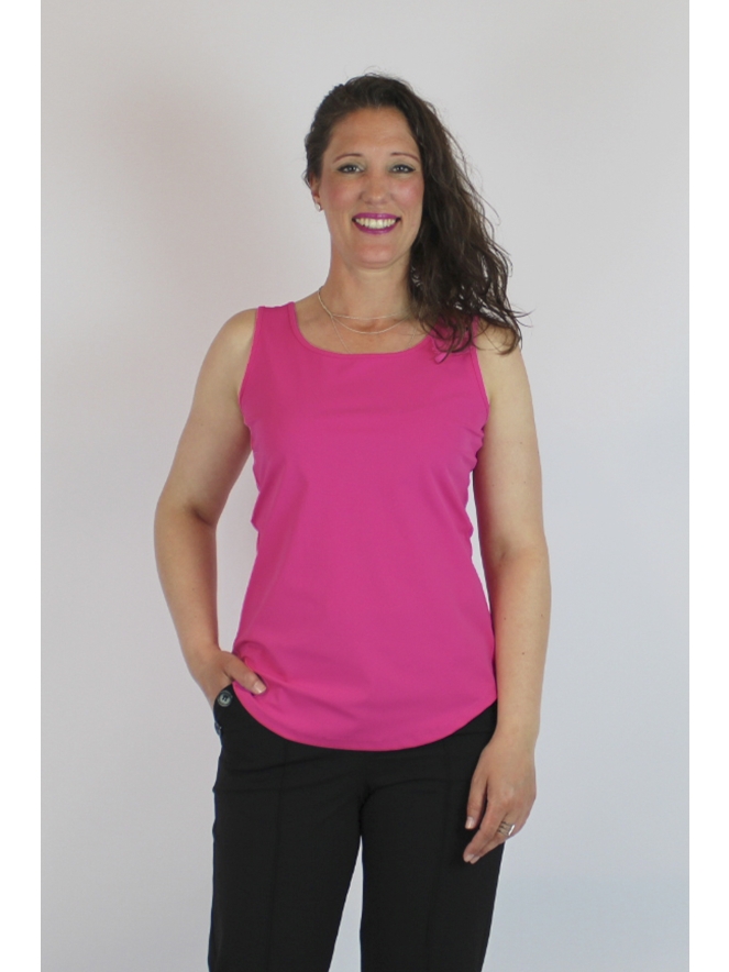 Dit hemd heeft brede schouder bandjes en is van travel stof.