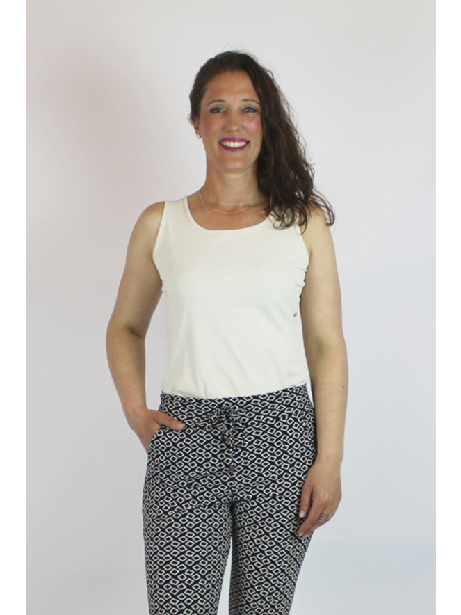 Dit hemd heeft brede schouder bandjes en is van travel stof.