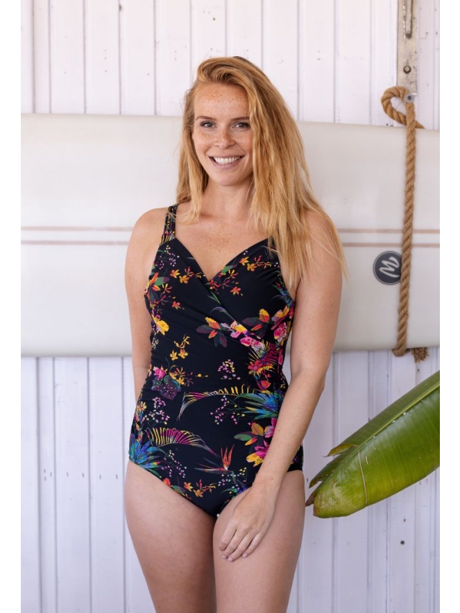 Dit badpak heeft bij de buste een overslag met dubbele stof. De binnentop heeft gevoerde voorgevormde cups.
