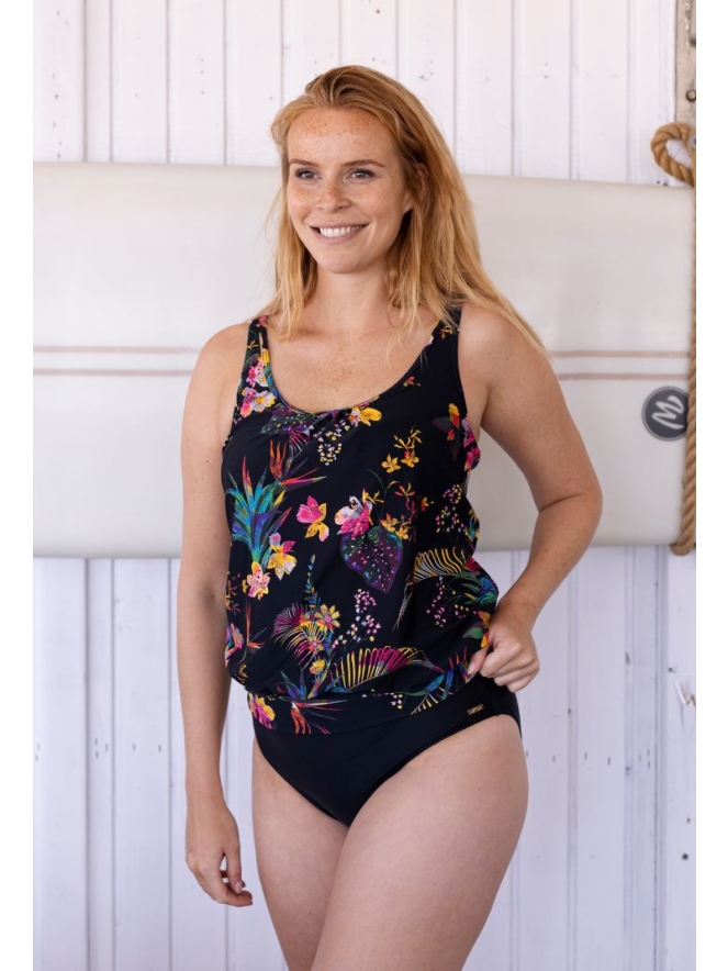 Deze tankini set bestaat uit een wijd vallende top met boord rond de middel en verstelbare schouderbandjes. De top heeft een binnentop met voorgevormde cups. Het bijgeleverde broekje is een net slip model.