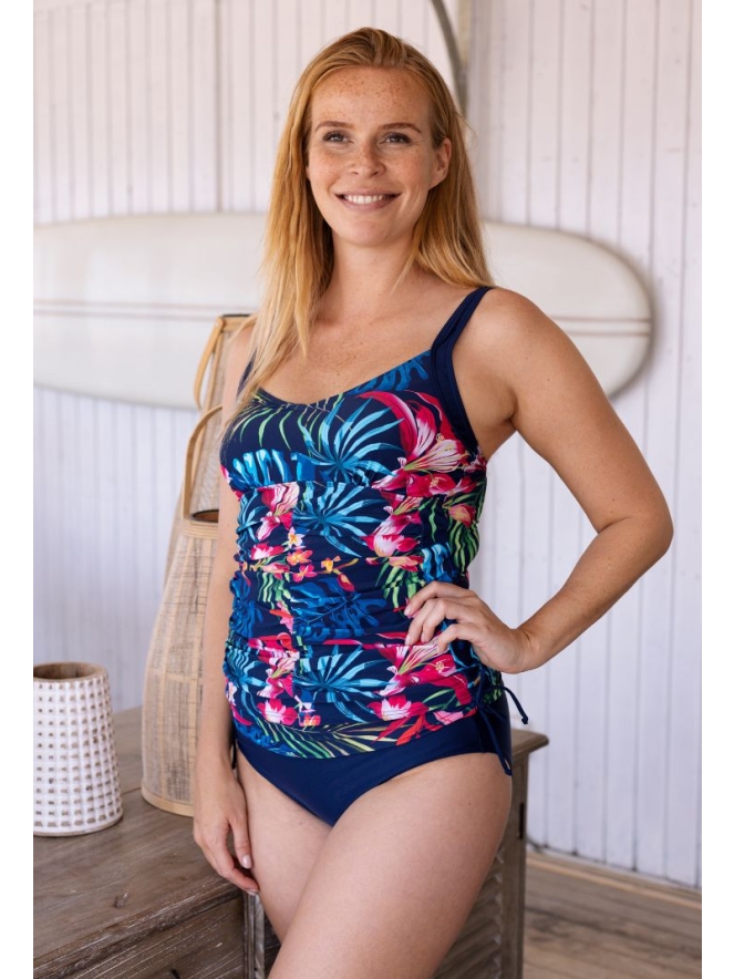 Deze tankini met verstelbare schouderbandjes en voorgevormde cups heeft een body met rimpeltjes die het silouet bekrachtigen. Het broekje heeft een brede omslag band met in de zij een koordje. De brede band kan ook naar boven gevouwen worden om er een hoger model broekje van te maken.
