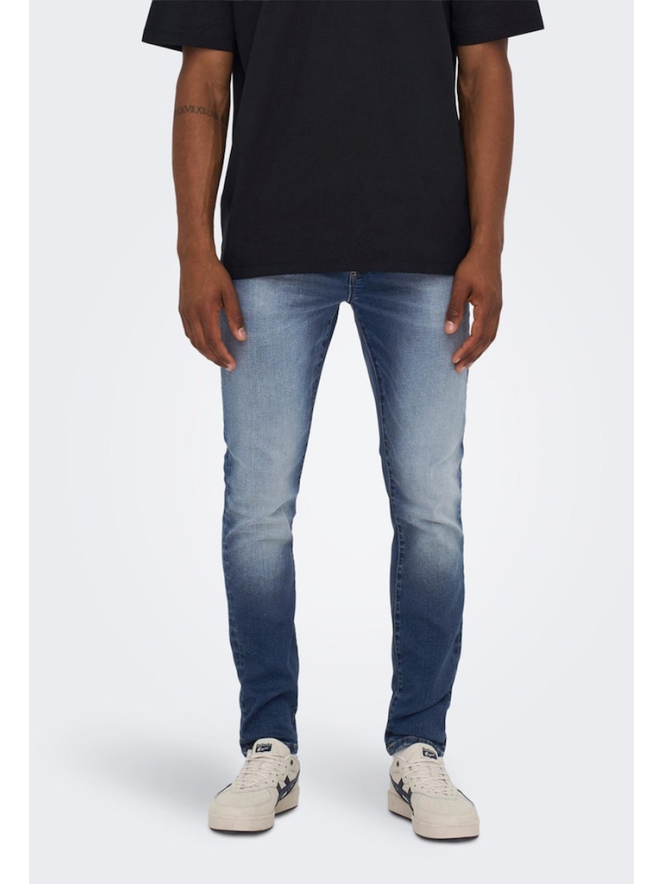 Slim-fit jeans van ONLY & SONS. Deze slim fit jeans met de naam LOOM is een klassieke 5-pocket jeans met rits sluiting en riemlussen. De jeans heeft een lage en slanke taille, en een smalle beenopening. Deze jeans is gemaakt van een zacht stretch denim om ervoor te zorgen dat hij de hele dag comfortabel blijft zitten, en daardoor makkelijk te dragen is. De jeans heeft een midden blauwe indigo wassing.