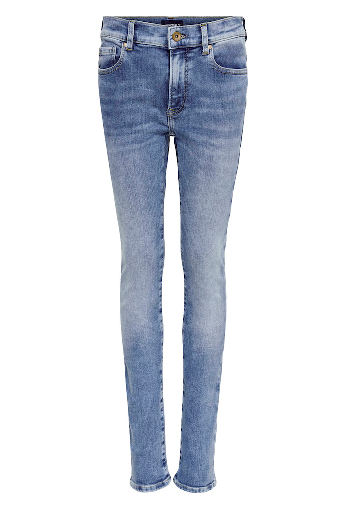Denim jeans van Only Kids. De jeans heeft een rechte pas vorm en een gebleekte look. Materiaal: 93% katoen, 5% elasthan. Wassen op 30 graden, niet bleken, niet in de droger, kan gestreken worden.
