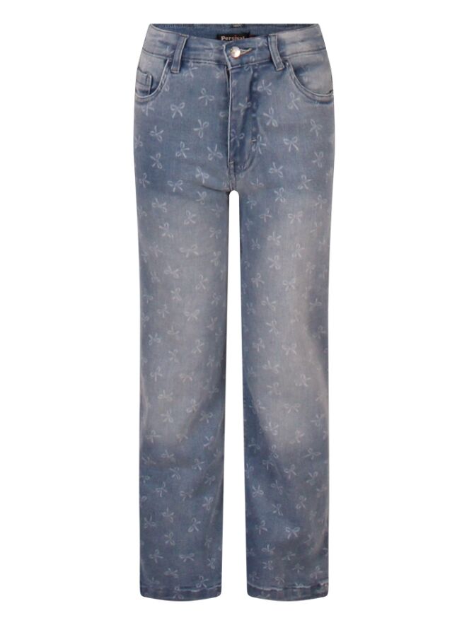 Denim jeans voor meisjes met een trendy gebleekte strikkenprint en een rechte pijp. Combineer deze must-have eenvoudig met een van onze sweaters voor een complete, modieuze look.