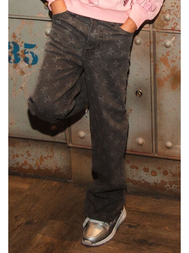 Denim jeans voor meisjes met een trendy gebleekte strikkenprint en een rechte pijp. Combineer deze must-have eenvoudig met een van onze sweaters voor een complete, modieuze look.