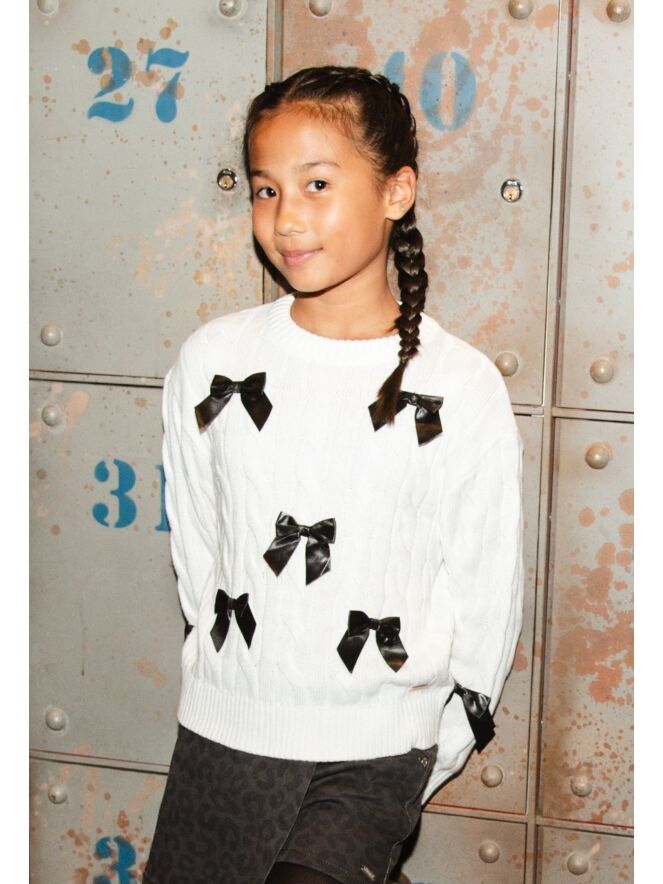 Deze warme kabeltrui is een echte trendsetter dit najaar/winter. Met dit exemplaar gaat de satijnen strikjestrend nog even door! Voor een modieuze look combineer je deze trui op een mooie jeans, maar staat ook erg leuk op een rokje in een bijpassende kleur.