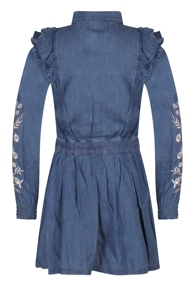 De ruches lopen speels van de voorkant naar de achterkant, met een schattige strik op de voorkant en bloemen geborduurde op de mouwen. Combineer met een legging of maillot voor een outfit.