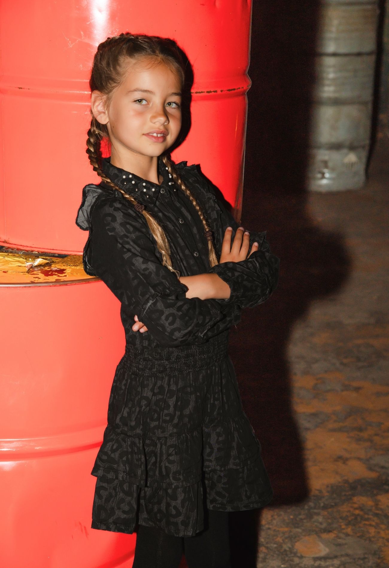 Dit chambray jurkje voor meisjes combineert een stoere uitstraling met lieve details. Het subtiele panterdessin geeft het jurkje een trendy look, terwijl de ruches die van de voorkant naar de achterkant lopen zorgen voor een speels silhouet. De kraag is versierd met stoere parels, wat een verrassend detail toevoegt dat het jurkje net dat beetje extra geeft. De smockband in de taille zorgt voor een comfortabele en flatterende pasvorm.