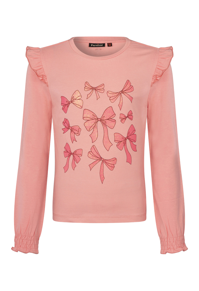Dit schattige shirt met lange mouwen voor meisjes heeft een glitter strikken print. De mouwen zijn afgewerkt met smokwerk voor een elastische fit en de ruches over de schouder geven het shirt een extra vrolijke uitstraling. Perfect voor een mix van comfort en stijl!