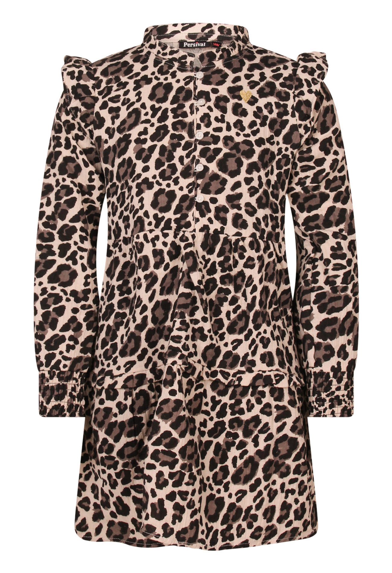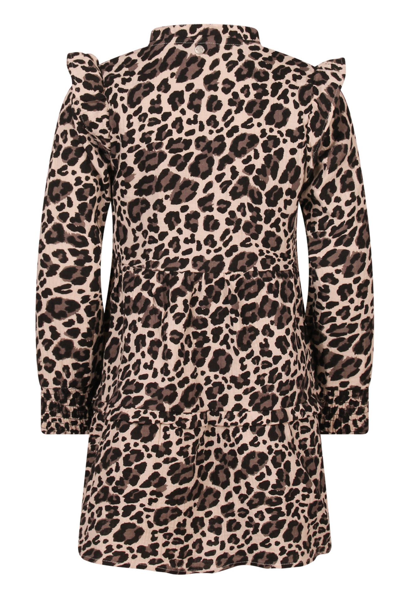 Deze meisjesjurk van luchtige mousseline is versierd met een trendy panterdessin en speelse ruches. Combineer de jurk met een maillot en een gilet voor een extra leuke en comfortabele look.