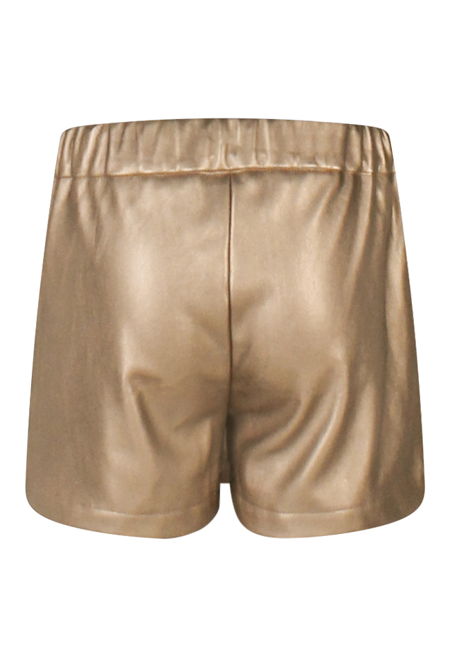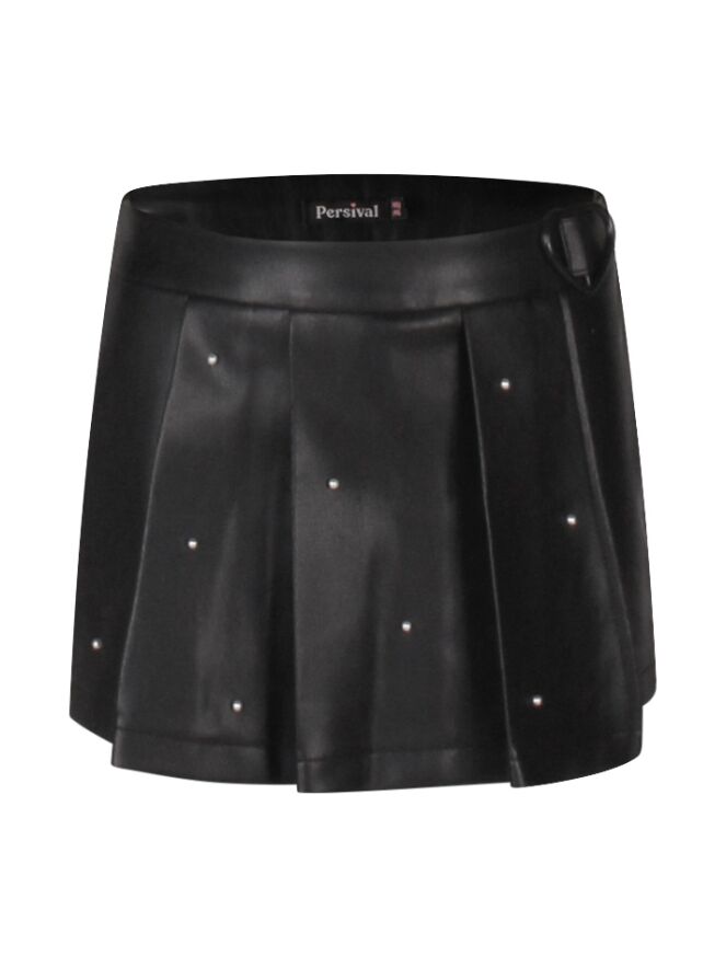 Deze stijlvolle PU skort combineert het gemak van een short met de look van een rokje. De geplooide overslag aan de voorkant geeft een speels rokjeffect, terwijl de parelstuds zorgen voor een subtiele, glamoureuze touch. Gemaakt van soepel leatherlook materiaal, is deze skort perfect voor meisjes die houden van een stoere maar vrouwelijke stijl.
