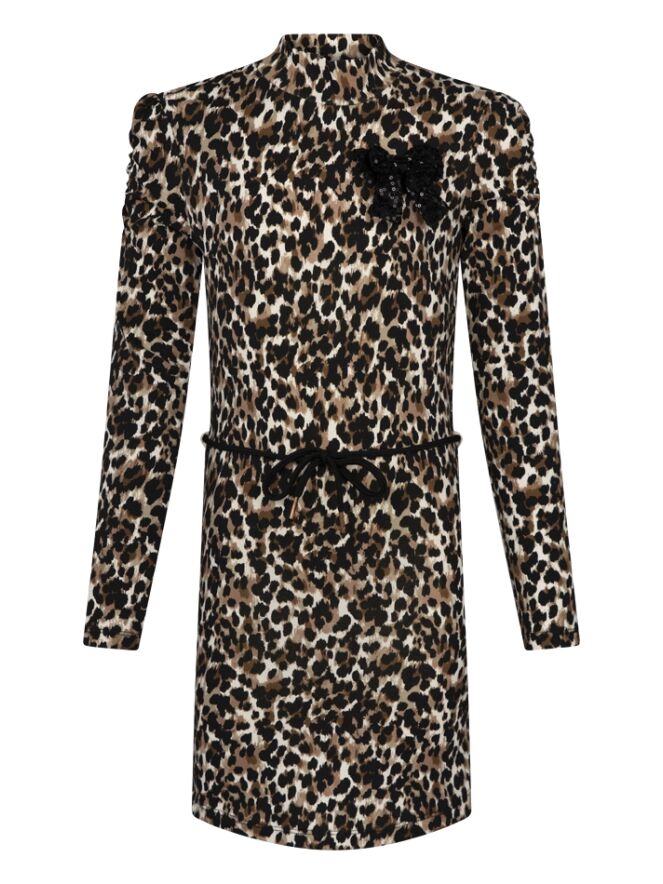 Roarrrr! Dit leuke panterjurkje heeft een turtleneck, riempje om de middel en een leuk pailletten strikje! Hou je niet van koordjes om de middel dan kan hij er ook gewoon af. Zwarte legging eronder met een warme winterschoen en je outfitje is klaar!