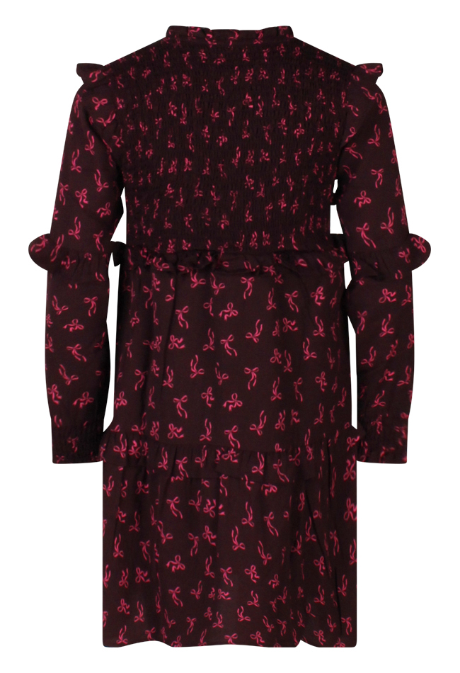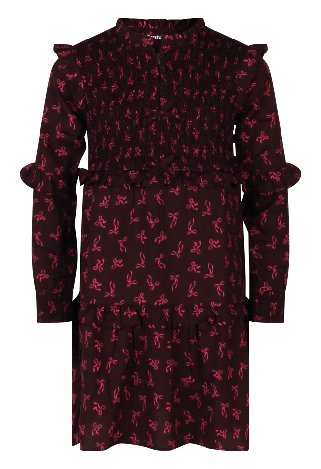 Hoe leuk is deze jurk met een all-over strikkenprint! De top is gemaakt van smockwerk, wat zorgt voor een elastische en comfortabele pasvorm. Op de schoudernaad loopt een speelse ruche, die het jurkje extra charmant maakt. Draag er een maillot onder en een stoer laarsje, en je dochter is helemaal klaar om de deur uit te gaan.