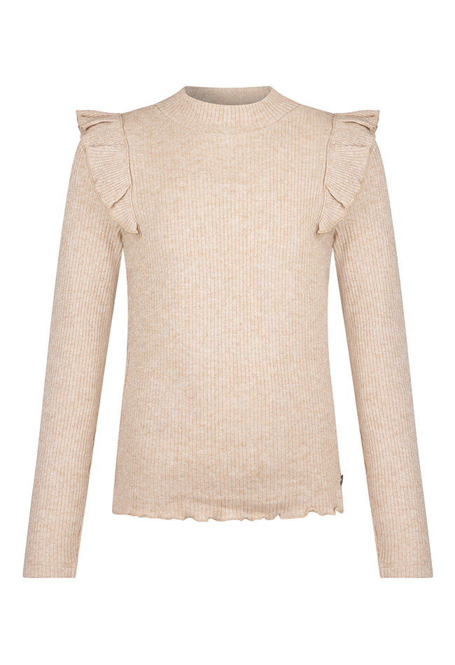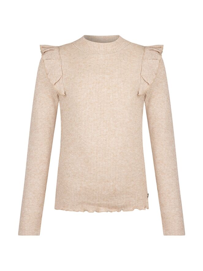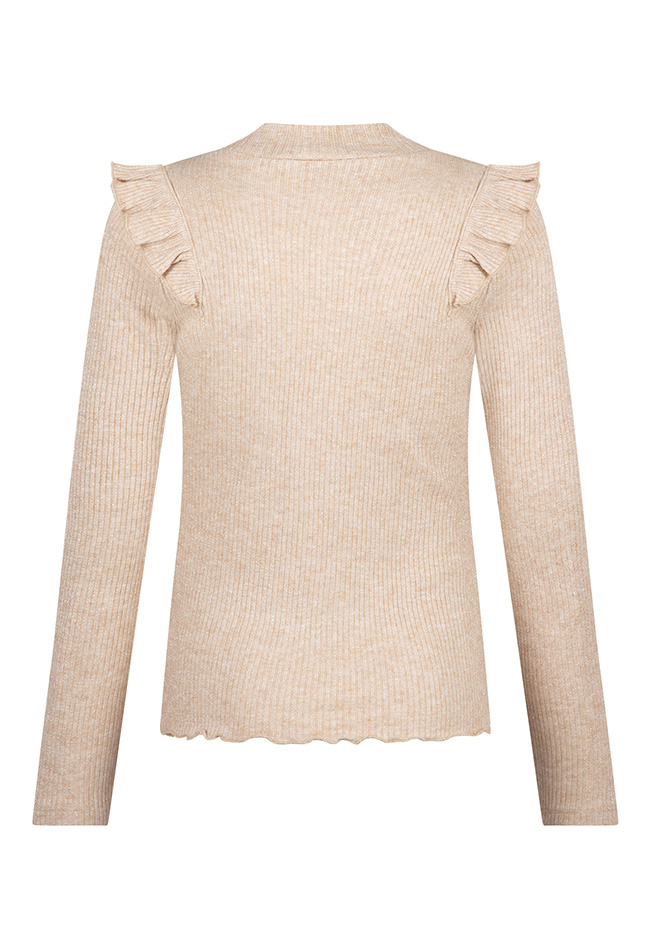 Deze meisjes top is gemaakt van zachte ribbrei met een vleugje lurex voor een subtiele glans, perfect voor speciale gelegenheden. De top heeft een comfortabele turtleneck en schattige ruches op de schouder voor een speels detail. Combineer met een bijpassende rok of broek voor een complete outfit.