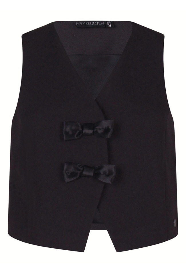 Hoe leuk is dit gilet voor meisjes! Simpel, maar met de satin strikjes op de voorkant krijgt het net dat beetje extra. Draag hem over een shirt met een nette pantalon, of op een glinsterend rokje voor een feestelijke look.