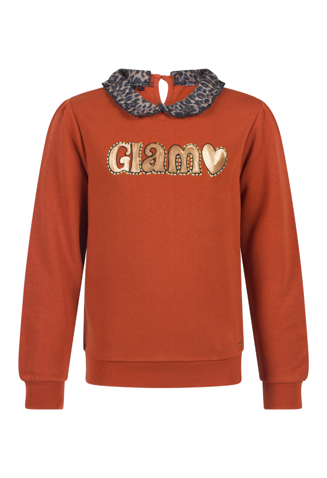Trui van Persival. De trui heeft een animal print kraagje en sequin tekst op de voorkant. Materiaal: 60% katoen, 40% polyester. Wassen op 30 graden, niet bleken, niet in de droger, kan gestreken worden.