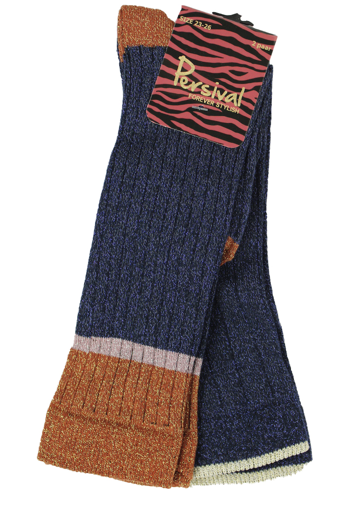 2 paar knie kousen van Persival. Beide paren hebben glitters, 1 paar heeft banen. Materiaal: 78% katoen, 20% polyamide, 2% elasthan. Wassen op 30 graden, niet bleken, niet in de droger.