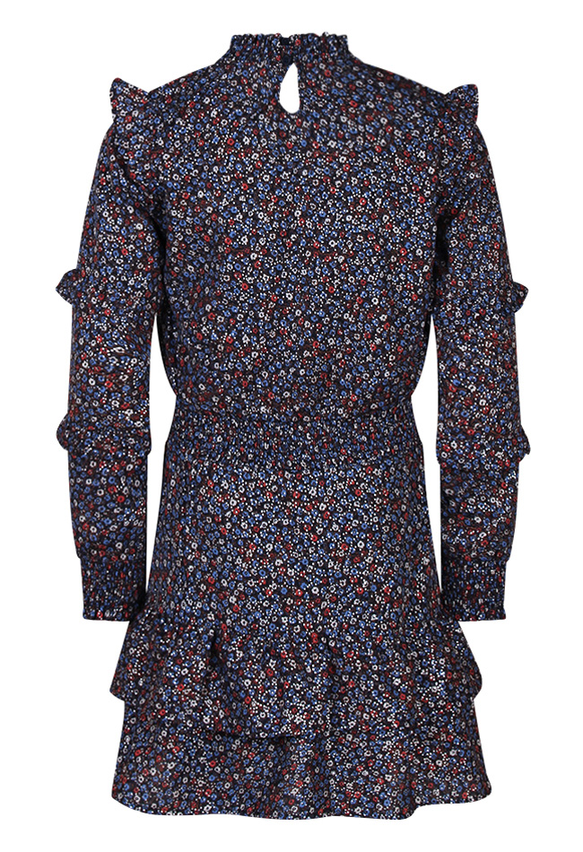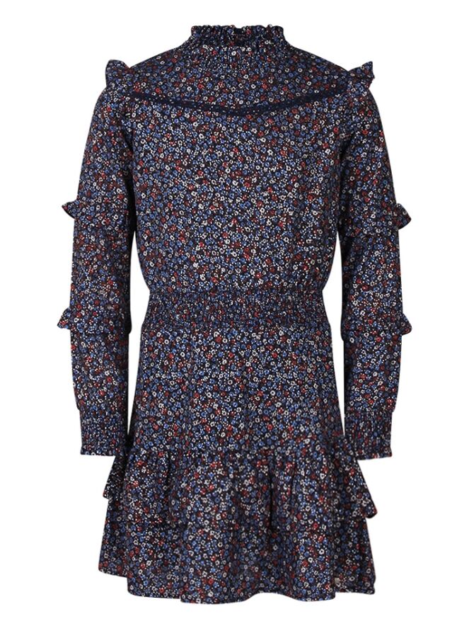 Dit charmante jurkje met lange mouwen heeft een prachtige bloemenprint. Het heeft een elastische taille en elastische uiteinden van de mouwen voor een comfortabele pasvorm. De rok heeft speelse laagjes. Het opstaande kraagje is eveneens elastisch.