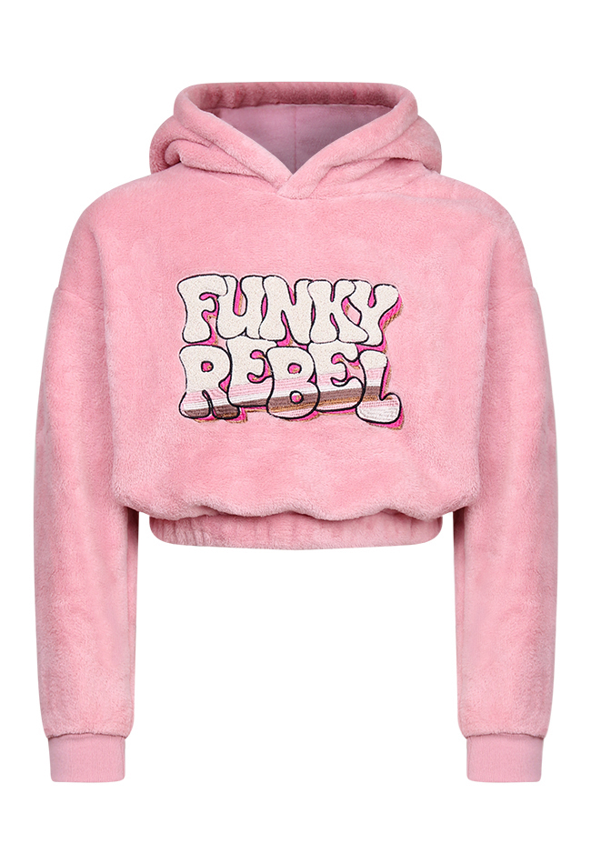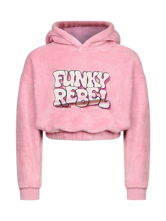 Deze super zachte meisjes trui is een kort model met voorop de tekst Funky rebel. Met capuchon.
