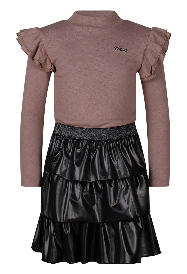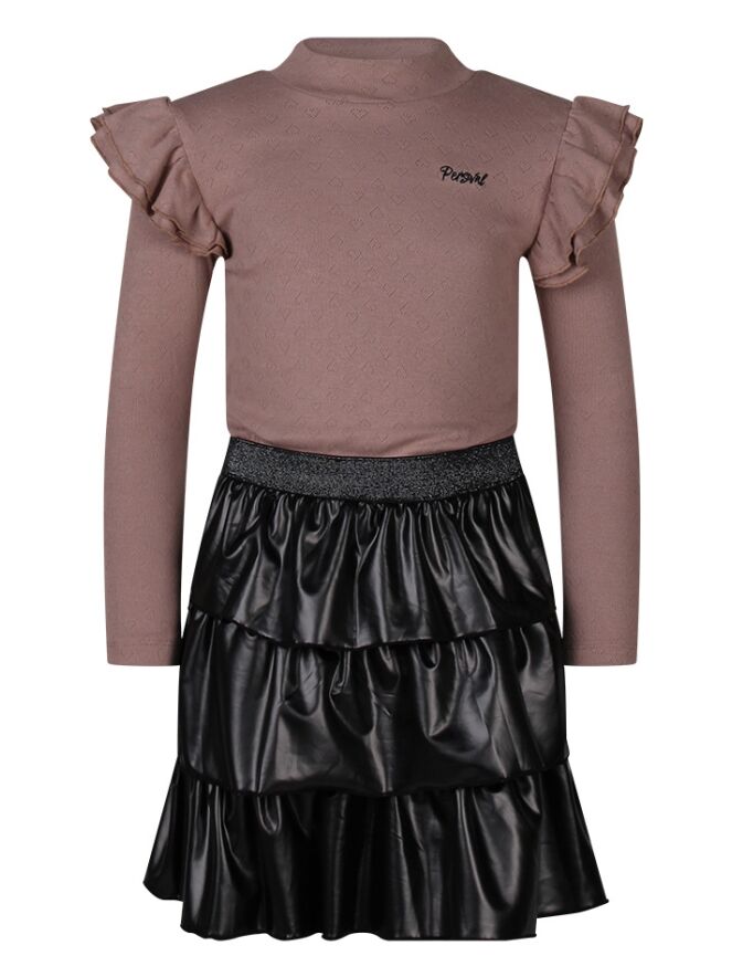 Jurk met lange mouwen en een turtleneck. Op de schouders zit een dubbele laag roezels. Het bovenste gedeelte is gemaakt van een ajour gebreide jersey met hartjes design, de taille is voorzien van een elastieken glitter band voor comfortabele pasvorm. De stroken rok is gemaakt van imitatie leer. Attentie: Dit artikel is gemaakt van een delicaat materiaal en is gevoelig voor beschadiging. Was het artikel apart en binnenstebuiten of in een waszakje. Wees extra voorzichtig met scherpe artikelen, zoals sieraden.