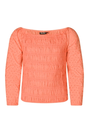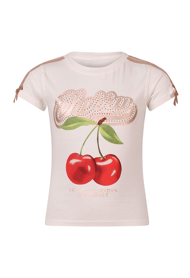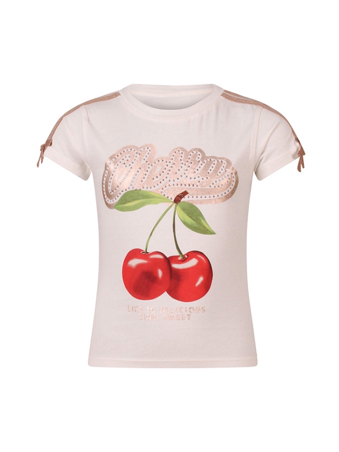 Dit meisjes T-shirt is een echte eyecatcher! Op de voorkant prijken grote kersen met fonkelende steentjes, die samen een speelse en glinsterende touch geven. De tekst Life is delicious and sweet maakt het helemaal af en brengt een vrolijke, zomerse vibe.