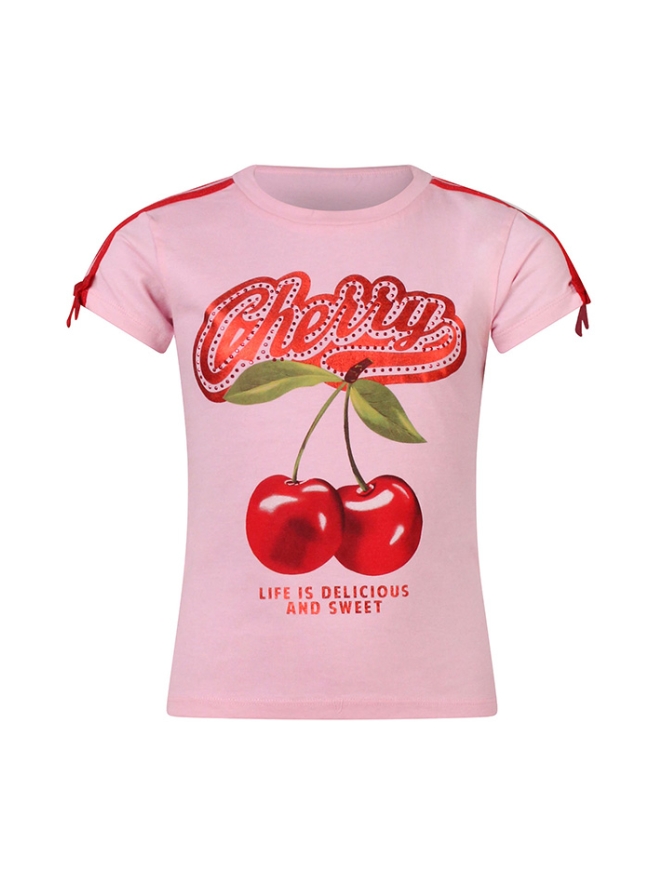 Dit meisjes T-shirt is een echte eyecatcher! Op de voorkant prijken grote kersen met fonkelende steentjes, die samen een speelse en glinsterende touch geven. De tekst Life is delicious and sweet maakt het helemaal af en brengt een vrolijke, zomerse vibe.