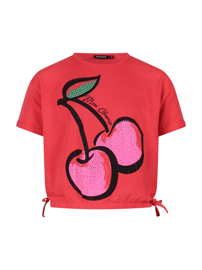Een hip T-shirt dat stijl, comfort en vrolijke details moeiteloos samenbrengt. Het shirt is versierd met een opvallende grote kersenprint, die sprankelt door de glinsterende strass stenen. Dankzij het elastiek in de taille is het shirt cropped, wat zorgt voor een trendy, moderne look. Gemaakt van zachte, comfortabele stof voelt het T-shirt heerlijk aan en is het perfect te combineren met een rok, short of jeans.