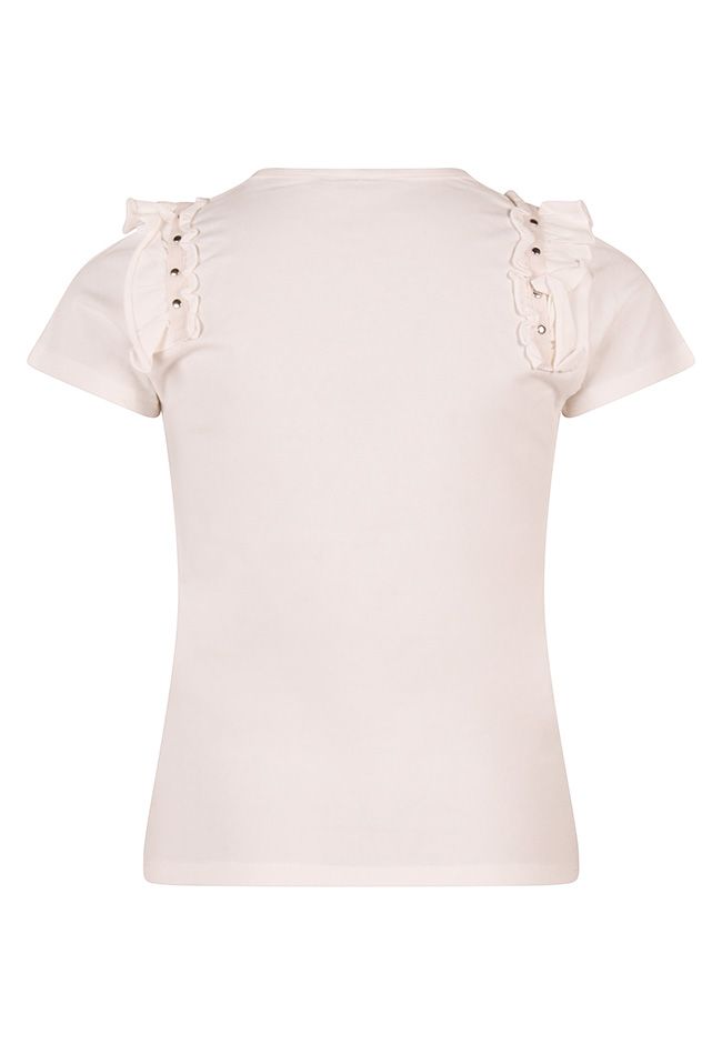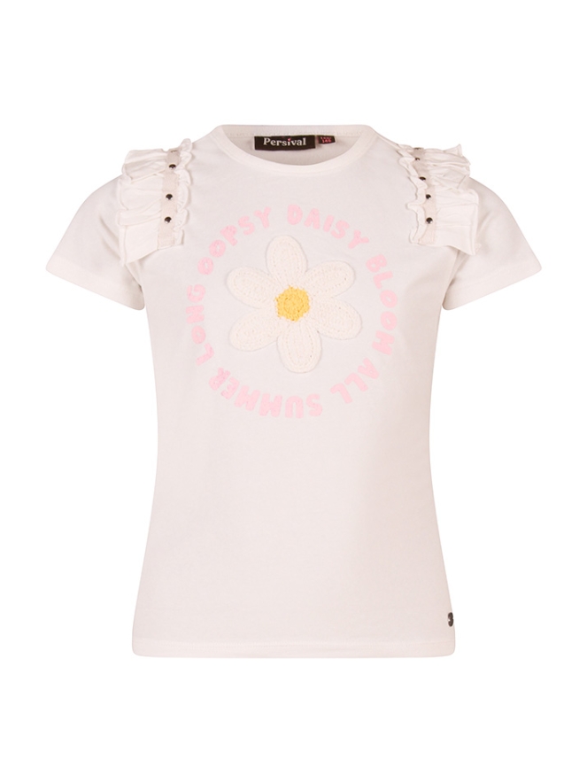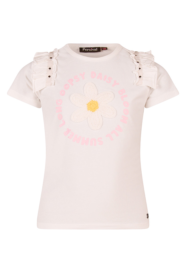 Dit schattige T-shirtje voor meisjes is een echte eyecatcher. Voorop een gehaakte crochette bloem met de vrolijke tekst Oopsy Daisy Bloom All Summer Long, wat een zomerse en speelse uitstraling geeft. De ruche op de schouder, afgewerkt met glanzende studs, voegt een subtiel, stijlvol detail toe en maakt het shirtje extra bijzonder. Gemaakt van zachte, comfortabele stof, ideaal voor dagelijks gebruik of zomerse uitjes.