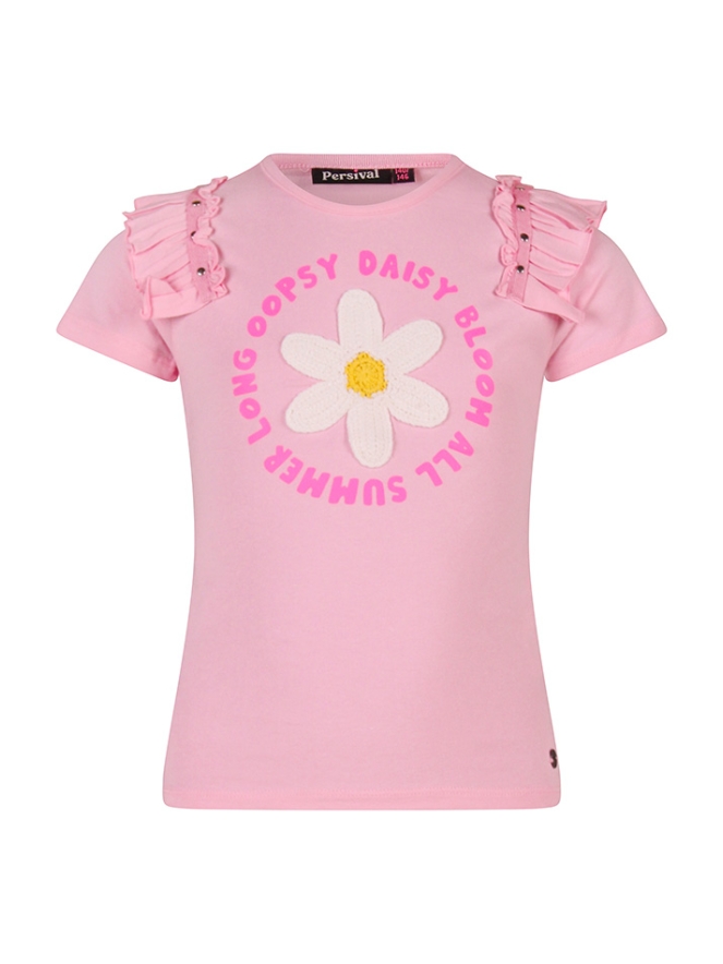 Dit schattige T-shirtje voor meisjes is een echte eyecatcher. Voorop een gehaakte crochette bloem met de vrolijke tekst Oopsy Daisy Bloom All Summer Long, wat een zomerse en speelse uitstraling geeft. De ruche op de schouder, afgewerkt met glanzende studs, voegt een subtiel, stijlvol detail toe en maakt het shirtje extra bijzonder. Gemaakt van zachte, comfortabele stof, ideaal voor dagelijks gebruik of zomerse uitjes.