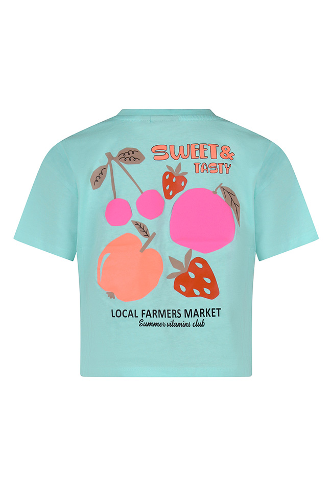Dit speelse T-shirt is een must-have voor zomerse dagen! Dankzij de boxy fit zit het lekker los en comfortabel, terwijl het een trendy, casual look geeft. Op de voorkant staat een sweet & tasty fruitprint, geïnspireerd op de vrolijke sfeer van een local farmers market. De zomerse kleuren maken het shirt extra fris en vrolijk, perfect om te combineren met een short, rok of jeans voor een zonnige, speelse outfit.