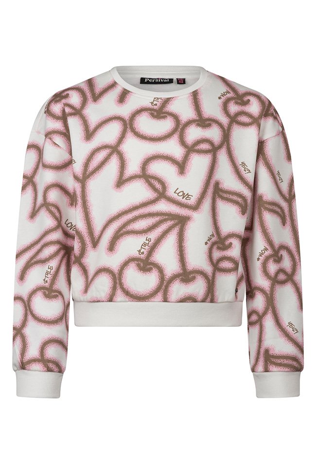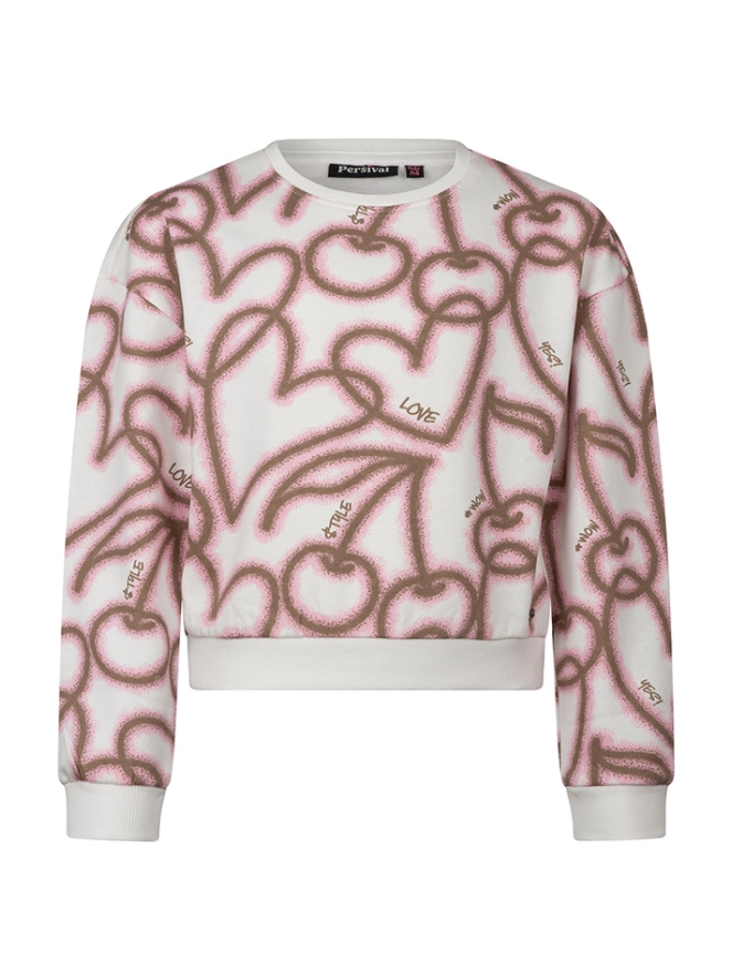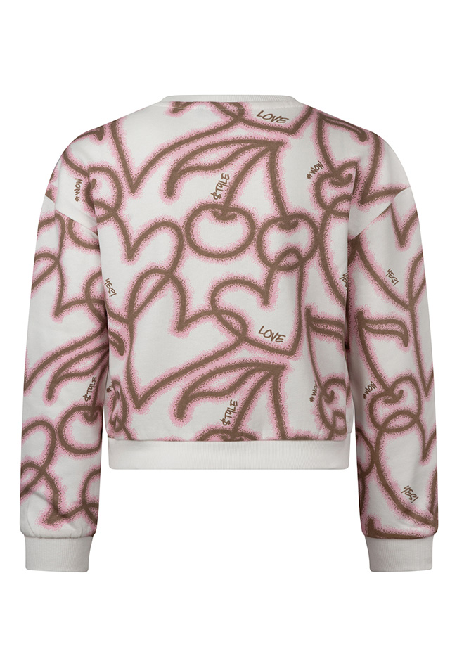 Kleurrijke sweater met een speelse graffiti print met hartjes en zoete kersen. Deze trui laat je stralen en houdt je lekker warm!