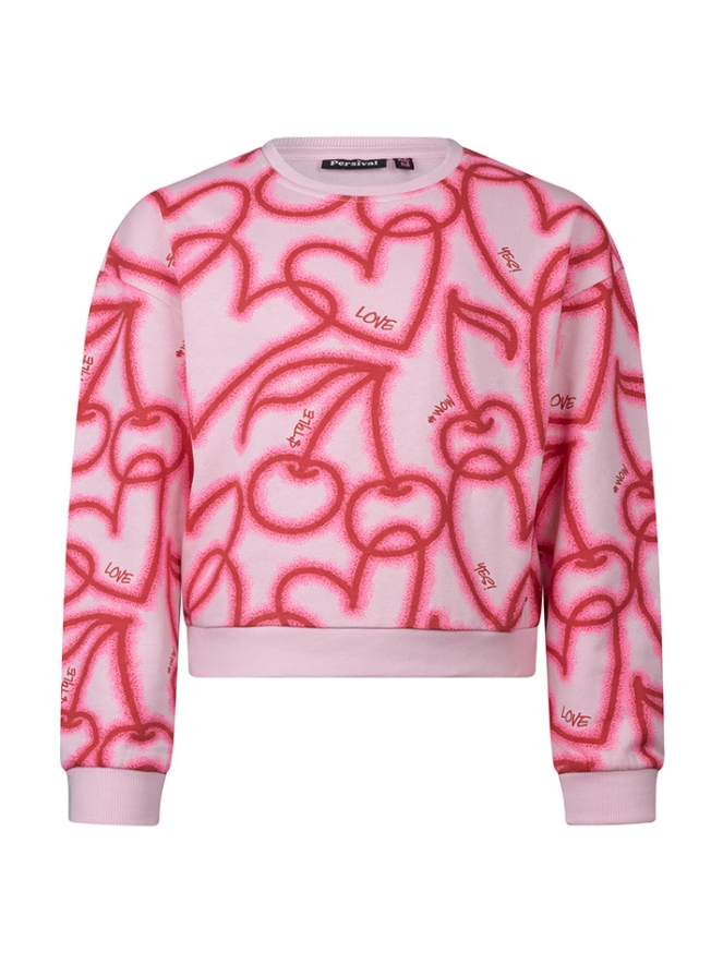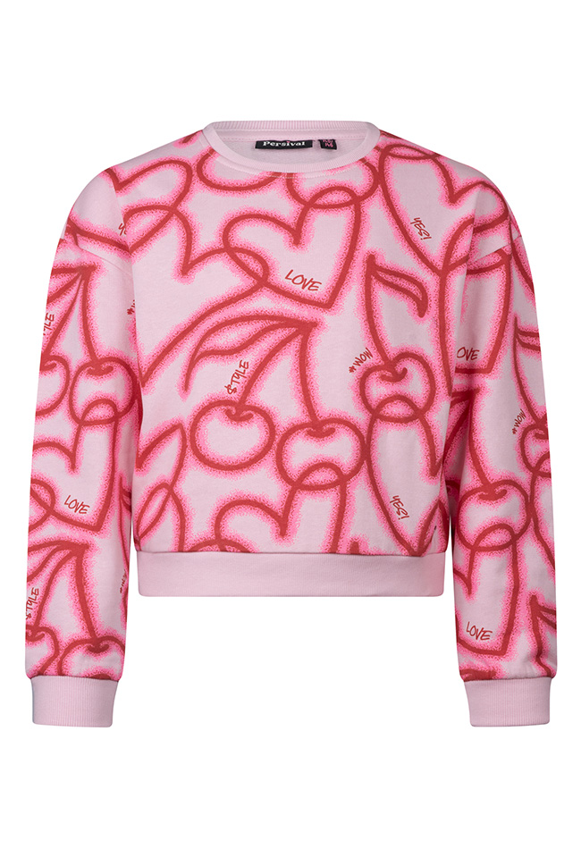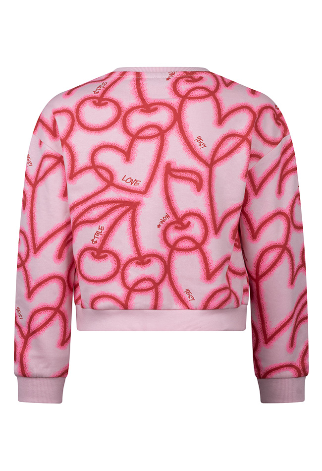 Kleurrijke sweater met een speelse graffiti print met hartjes en zoete kersen. Deze trui laat je stralen en houdt je lekker warm!