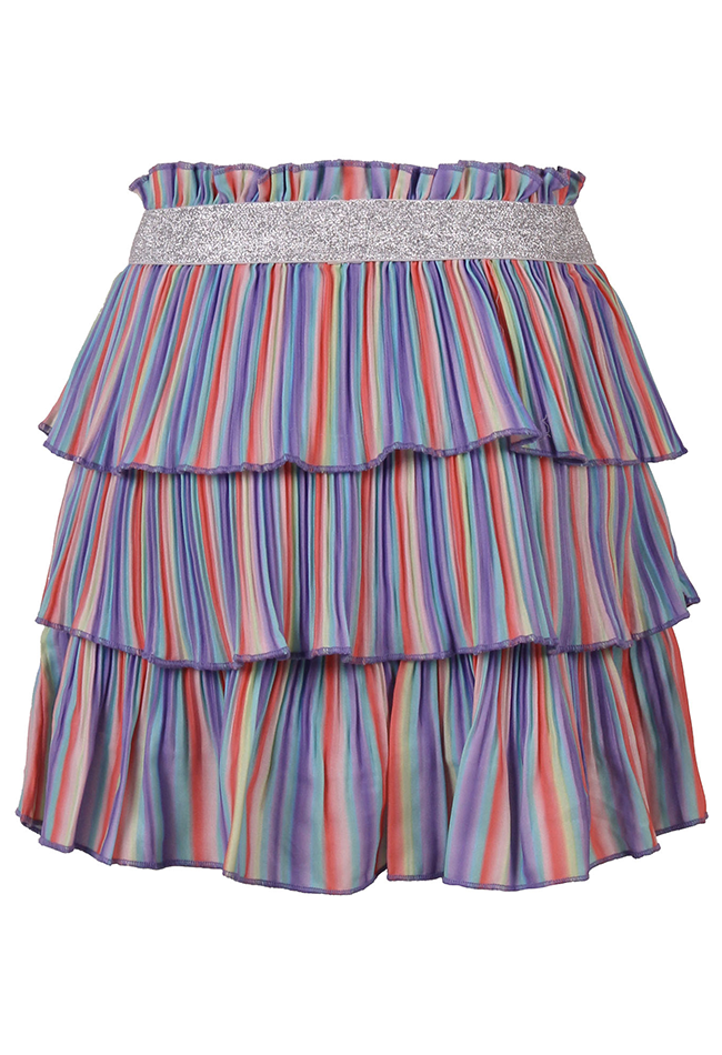 Op zoek naar een vrolijke en trendy meisjes rok? Deze plissé rok van Persival met kleurrijke regenboogprint is een echte must-have voor elke meisjesgarderobe. De speelse print en luchtige stof maken deze rok perfect voor zowel dagelijkse outfits als feestelijke momenten. De rok is gemaakt van een soepele crêpe stof met een zachte katoenen voering, waardoor hij niet alleen mooi valt maar ook comfortabel draagt. De plissé afwerking zorgt voor een speels en zwierig effect bij elke beweging. Dankzij de elastische tailleband trek je de rok makkelijk aan en zit hij altijd fijn. De mini lengte geeft de rok een frisse, zomerse uitstraling en maakt hem ideaal om te combineren met een T-shirt, top of blouse.