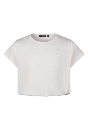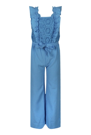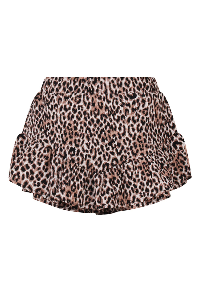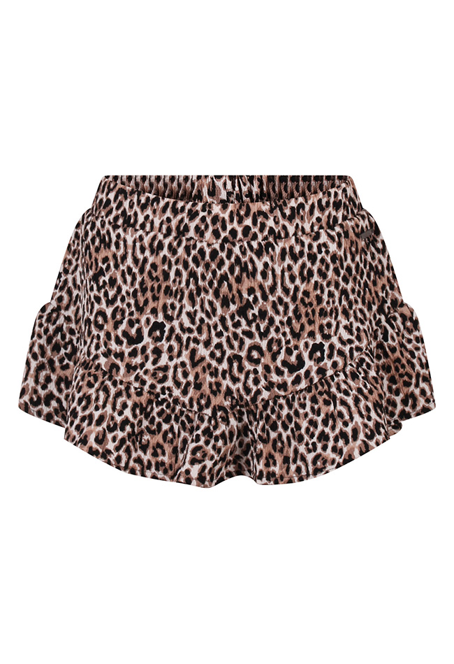 Meisjes broekje in een crinkle stof met een trendy panterdessin. Afgewerkt met speelse ruches voor een vrolijke en modieuze uitstraling.