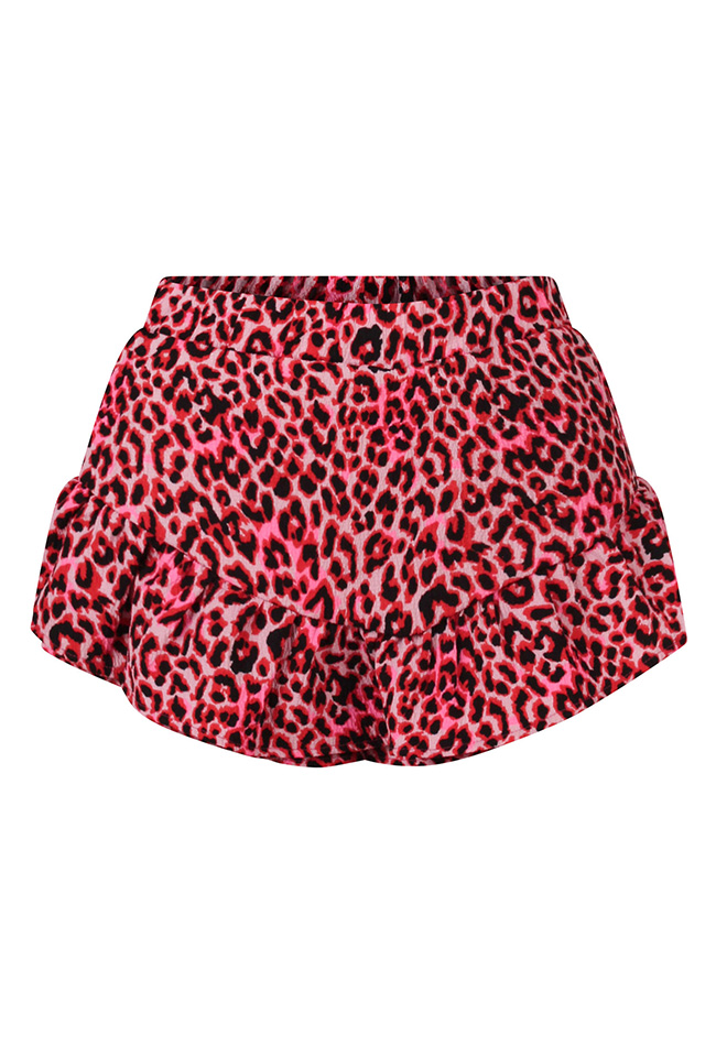 Meisjes broekje in een crinkle stof met een trendy panterdessin. Afgewerkt met speelse ruches voor een vrolijke en modieuze uitstraling.