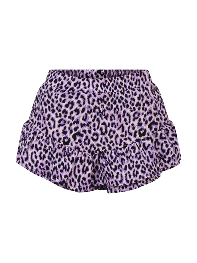 Meisjes broekje in een crinkle stof met een trendy panterdessin. Afgewerkt met speelse ruches voor een vrolijke en modieuze uitstraling.