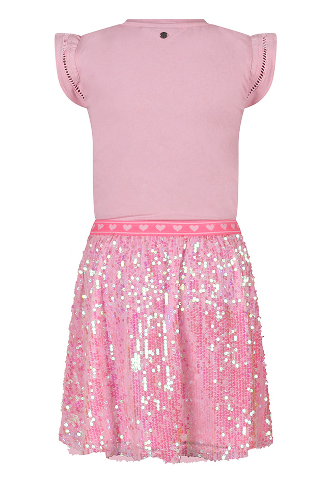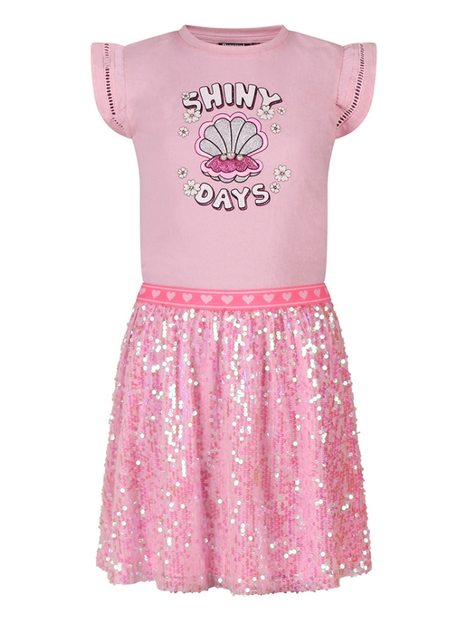 Dit speelse jurkje combineert het comfort van een T-shirt met de glamour van een paillettenrok. De bovenkant als een gewoon T-shirt terwijl de vastgestikte rok vol glinsterende pailletten zorgt voor een vrolijke twist. De print op de top is afgewerkt met dikke parels die zorgen voor een extra luxe en opvallend detail. Subtiel? Zeker niet. Fabulous? Absoluut.