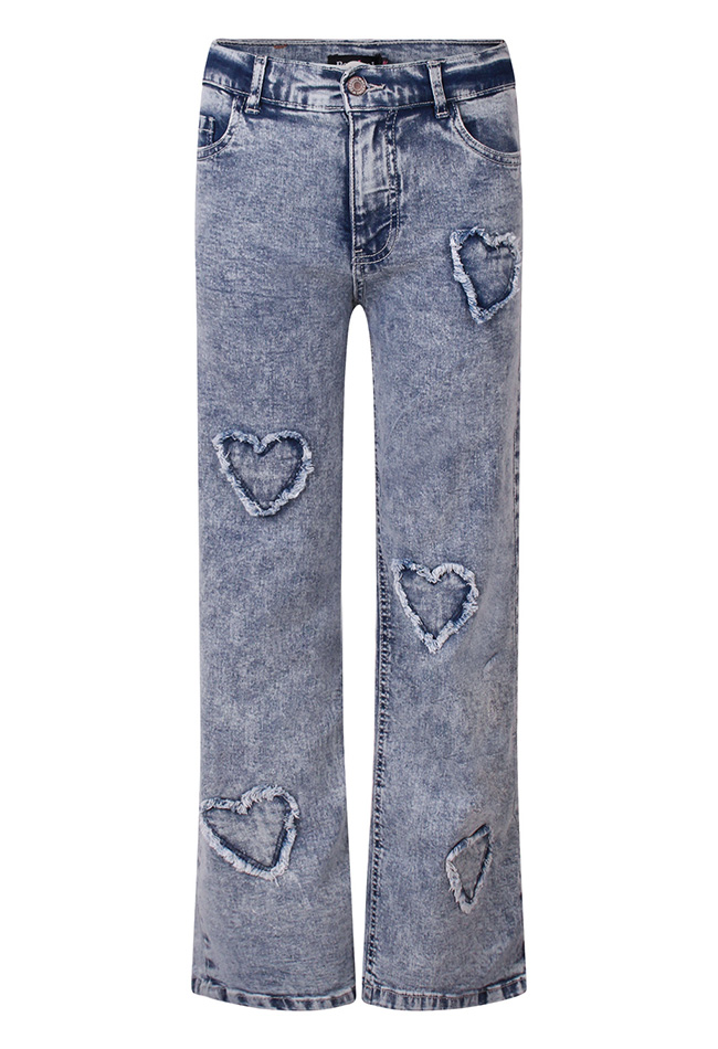 Stoere meisjes jeans met opgestikte hartjes. De broek heeft een rechte pijp en een mooie bleached wassing.
