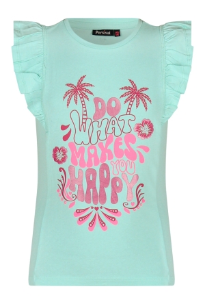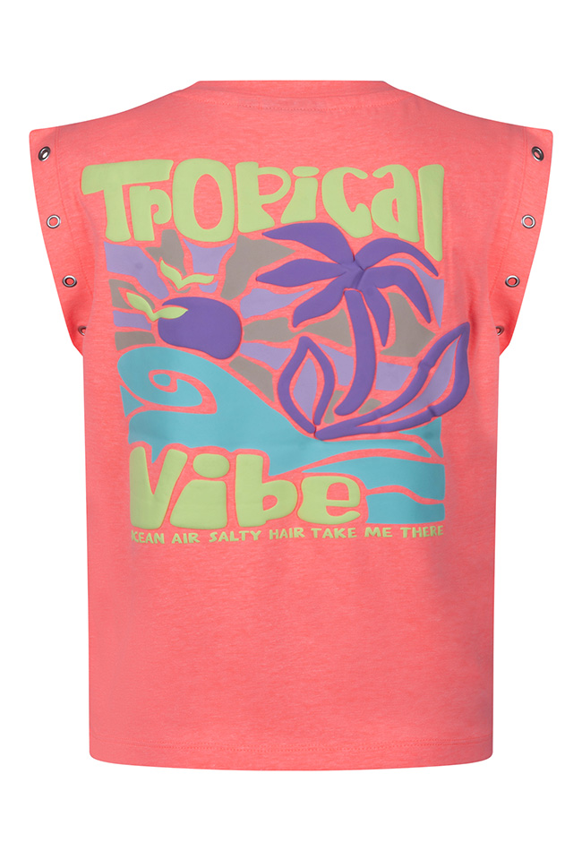 Deze vrolijke meisjes singlet brengt je meteen in tropische sferen. De frisse kleuren en zomerse look maken dit het perfecte item voor zonnige dagen. De eyecatcher? De stijlvolle rugprint met de tekst Ocean air, salty hair, take me there. Ideaal voor kleine strandliefhebbers en avonturiers. De speelse nestels in het armgat geven de top een trendy en unieke twist.