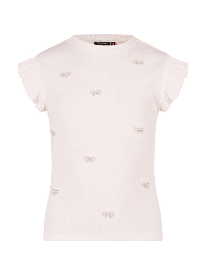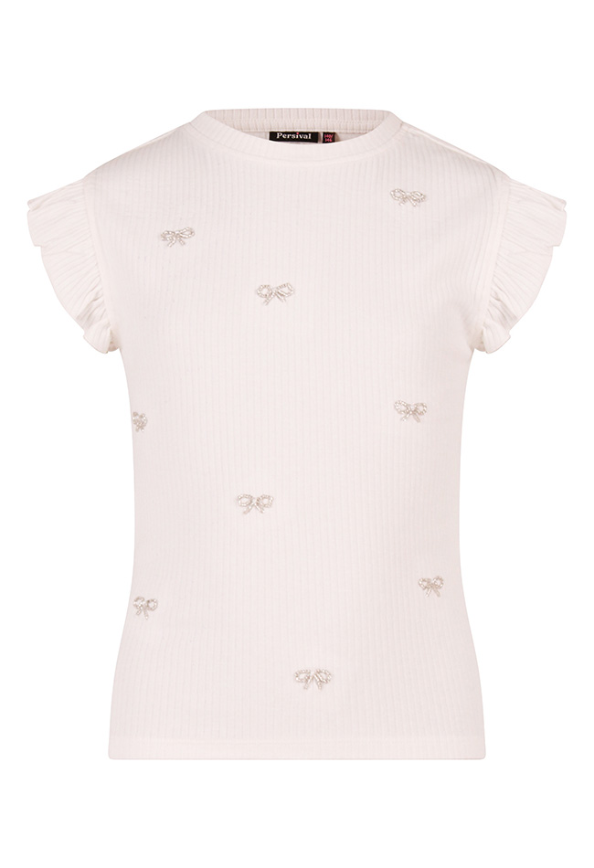 Dit schattige T-shirtje voor meisjes combineert comfort met een trendy, speels detail. Op de voorkant zijn kleine strikjes gevormd uit glinsterende kraaltjes, wat een vrolijke en elegante touch geeft. Gemaakt van zachte stretch stof voelt het heerlijk comfortabel. Perfect te combineren met een rokje, legging of broekje voor een complete, stijlvolle look.
