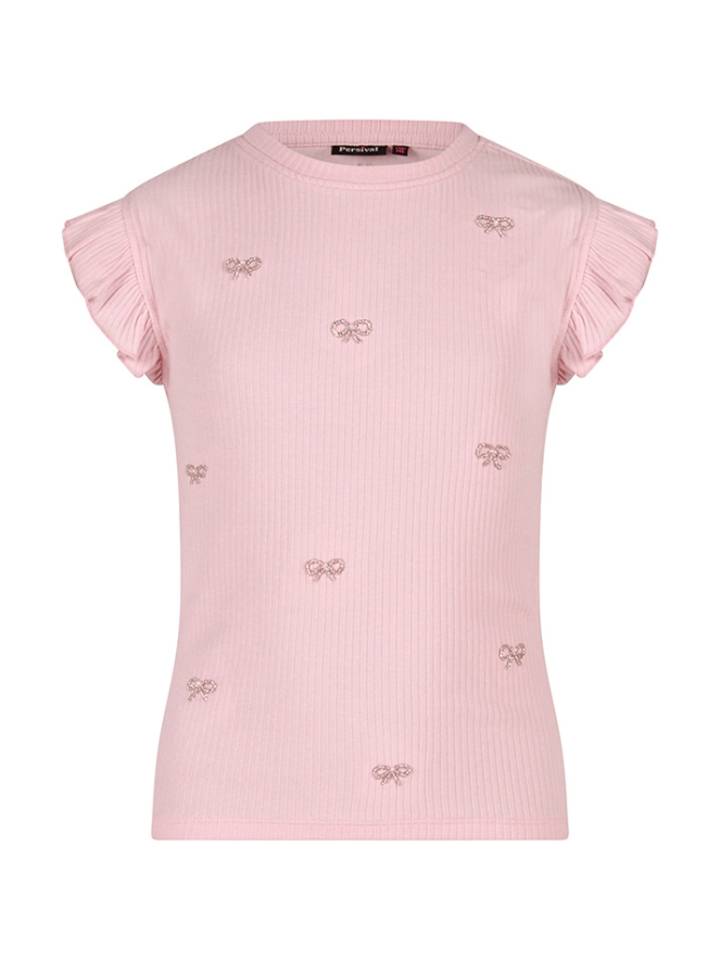 Dit schattige T-shirtje voor meisjes combineert comfort met een trendy, speels detail. Op de voorkant zijn kleine strikjes gevormd uit glinsterende kraaltjes, wat een vrolijke en elegante touch geeft. Gemaakt van zachte stretch stof voelt het heerlijk comfortabel. Perfect te combineren met een rokje, legging of broekje voor een complete, stijlvolle look.